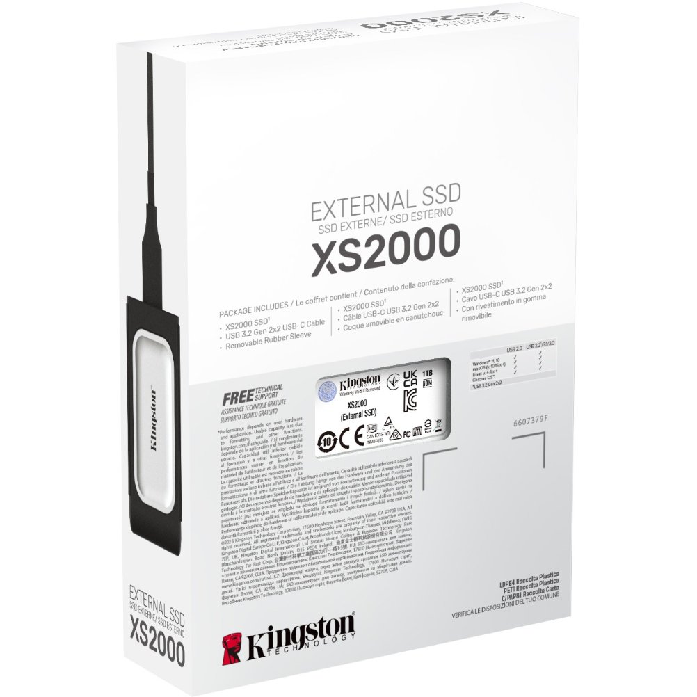 Kingston Technology 1000G Tragbare SSD XS2000. SSD Speicherkapazität: 1 TB. USB-Anschlusstyp: USB Typ-C, USB-Version: 3.2 Gen 2 (3.1 Gen 2). Lesegeschwindigkeit: 2000 MB/s, Schreibgeschwindigkeit: 2000 MB/s. Produktfarbe: Schwarz, Silber