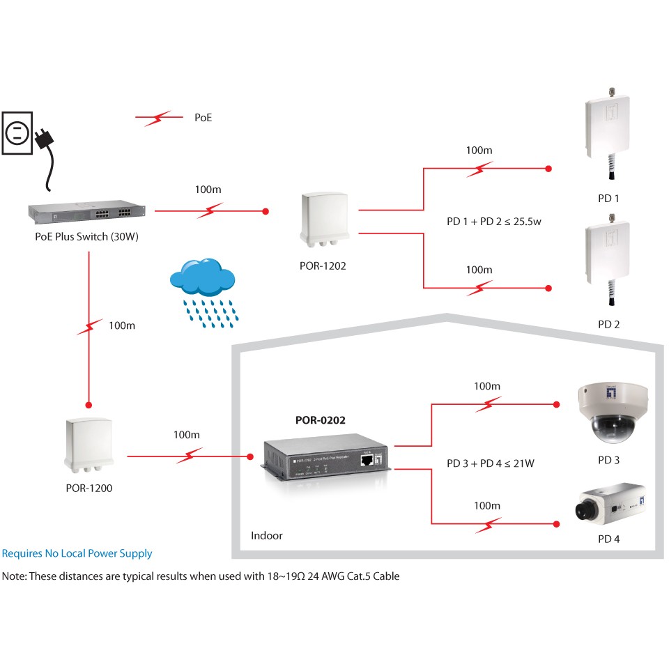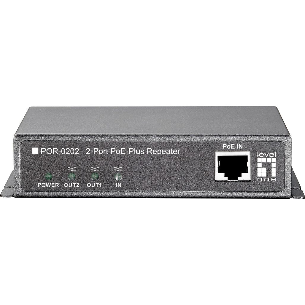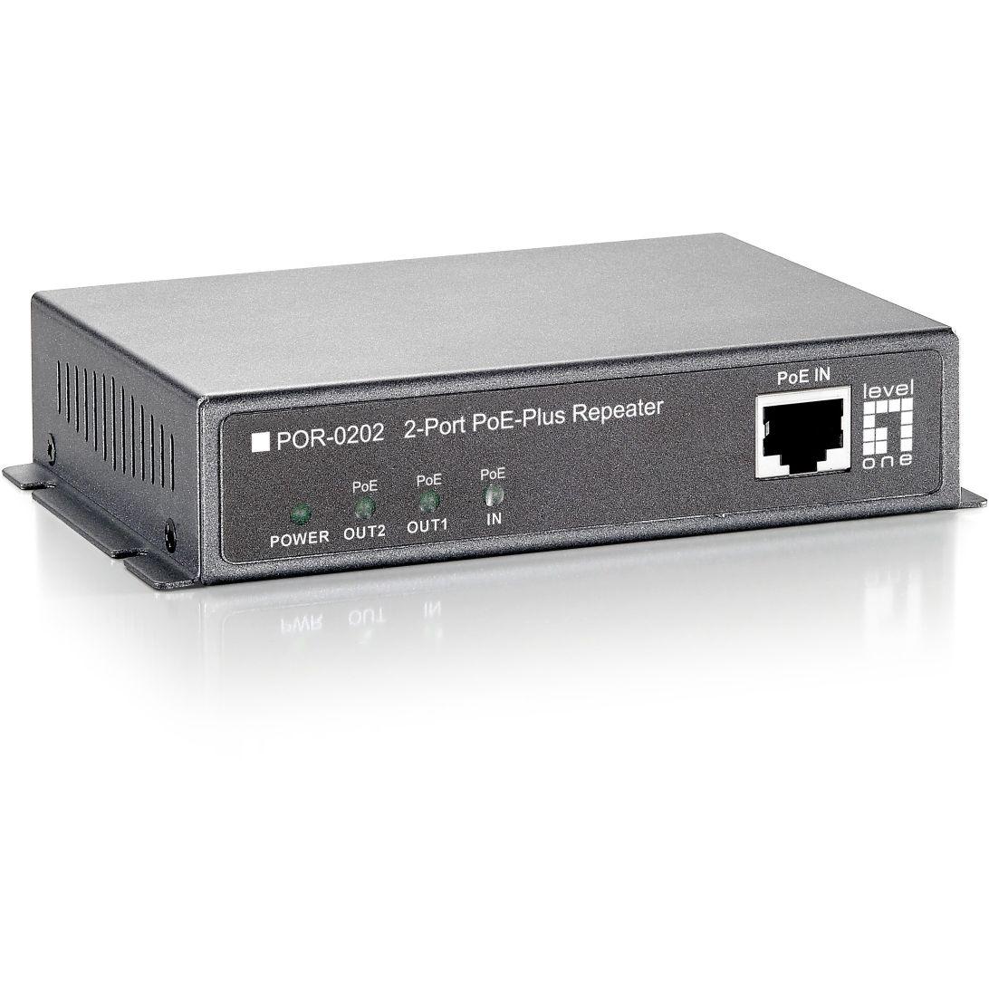 LevelOne PoE-Repeater, 2 Ports, Kaskadier, 802.3at PoE+. Typ: Netzwerk-Repeater, Maximal mögliche Übertragungsstrecke: 100 m. Verkabelungstechnologie: 10/100Base-T(X), Netzstandard: IEEE 802.3, IEEE 802.3af, IEEE 802.3at, IEEE 802.3u, IEEE 802.3x. Produktfarbe: Schwarz, Befestigungstyp: Wand, LED-Anzeigen: PoE, Leistung. Stromverbrauch (max.): 2,5 W. Breite: 130 mm, Tiefe: 90 mm, Höhe: 28 mm