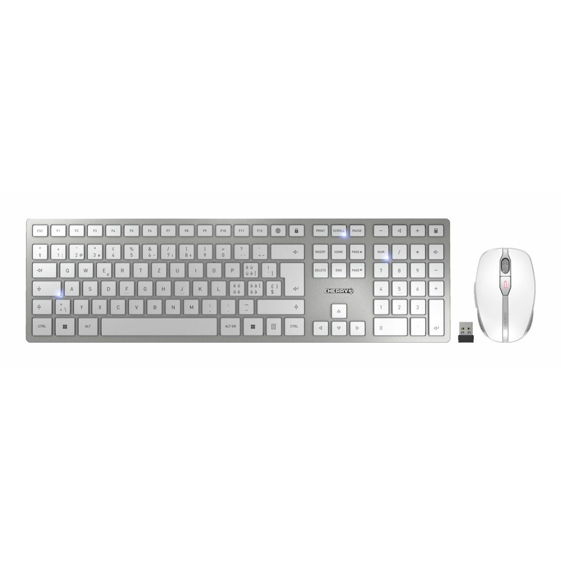 CHERRY DW 9100 SLIM. Tastatur Formfaktor: Volle Größe (100%). Tastatur-Stil: Gerade. Übertragungstechnik: Kabellos, Geräteschnittstelle: RF Wireless + Bluetooth, Tastatur-Switch: Scherenschalter, Tastaturaufbau: QWERTZ, Tastatur – Tastenanzahl: 111, Empfohlene Nutzung: Heimbüro. Produktfarbe: Silber, Weiß. Maus enthalten