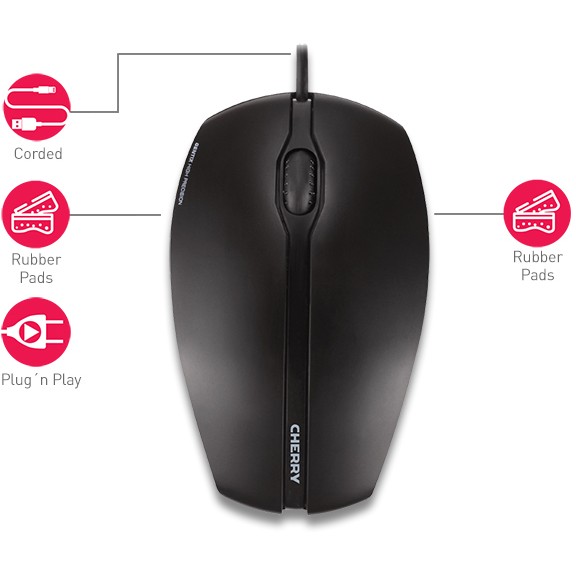 CHERRY GENTIX CORDED ILLUMINATED Maus, Schwarz, USB. Formfaktor: Beidhändig. Bewegungerfassungs Technologie: Optisch, Geräteschnittstelle: USB Typ-A, Bewegung Auflösung: 1000 DPI, Tastentyp: Gedrückte Tasten, Knopfanzahl: 3, Scroll Typ: Rad. Energiequelle: Kabel. Produktfarbe: Schwarz