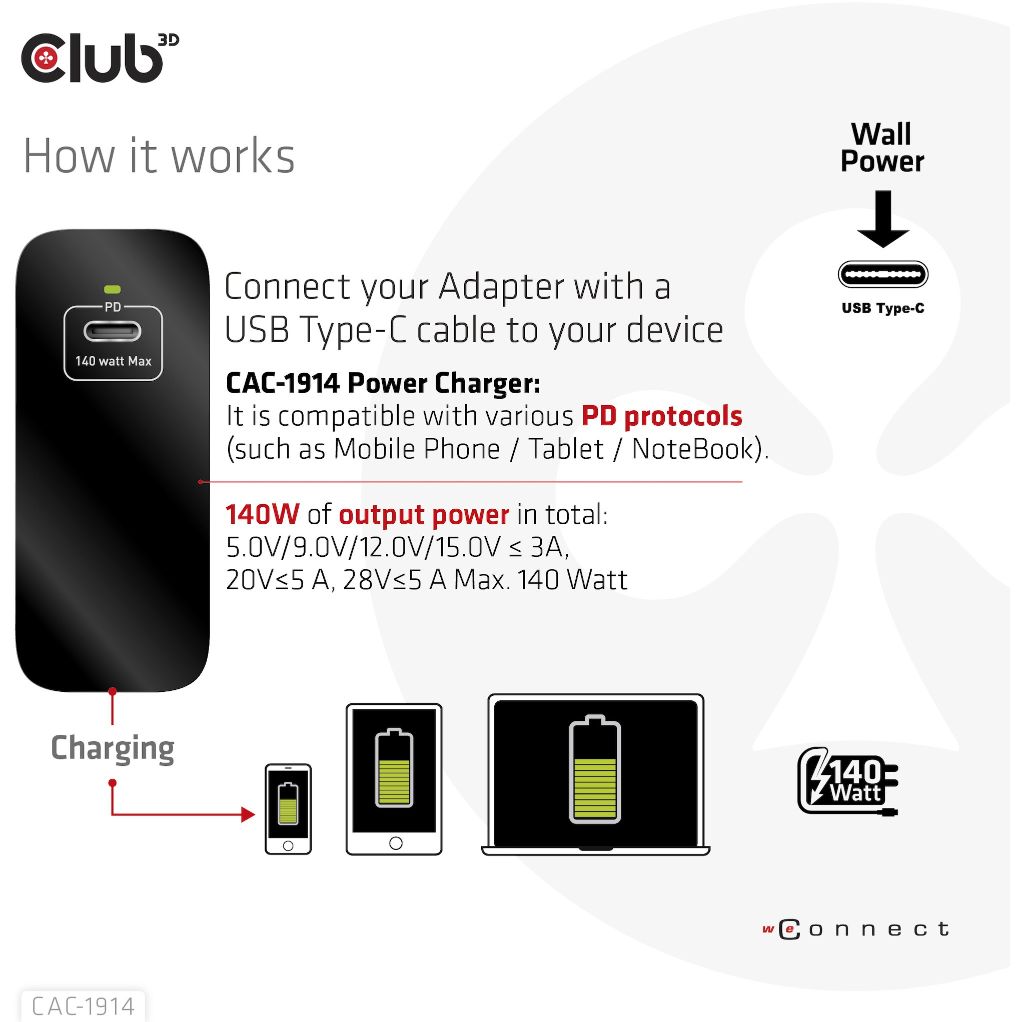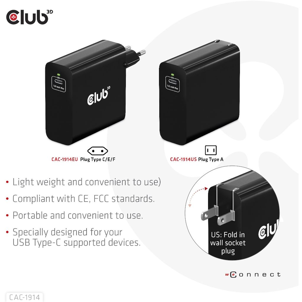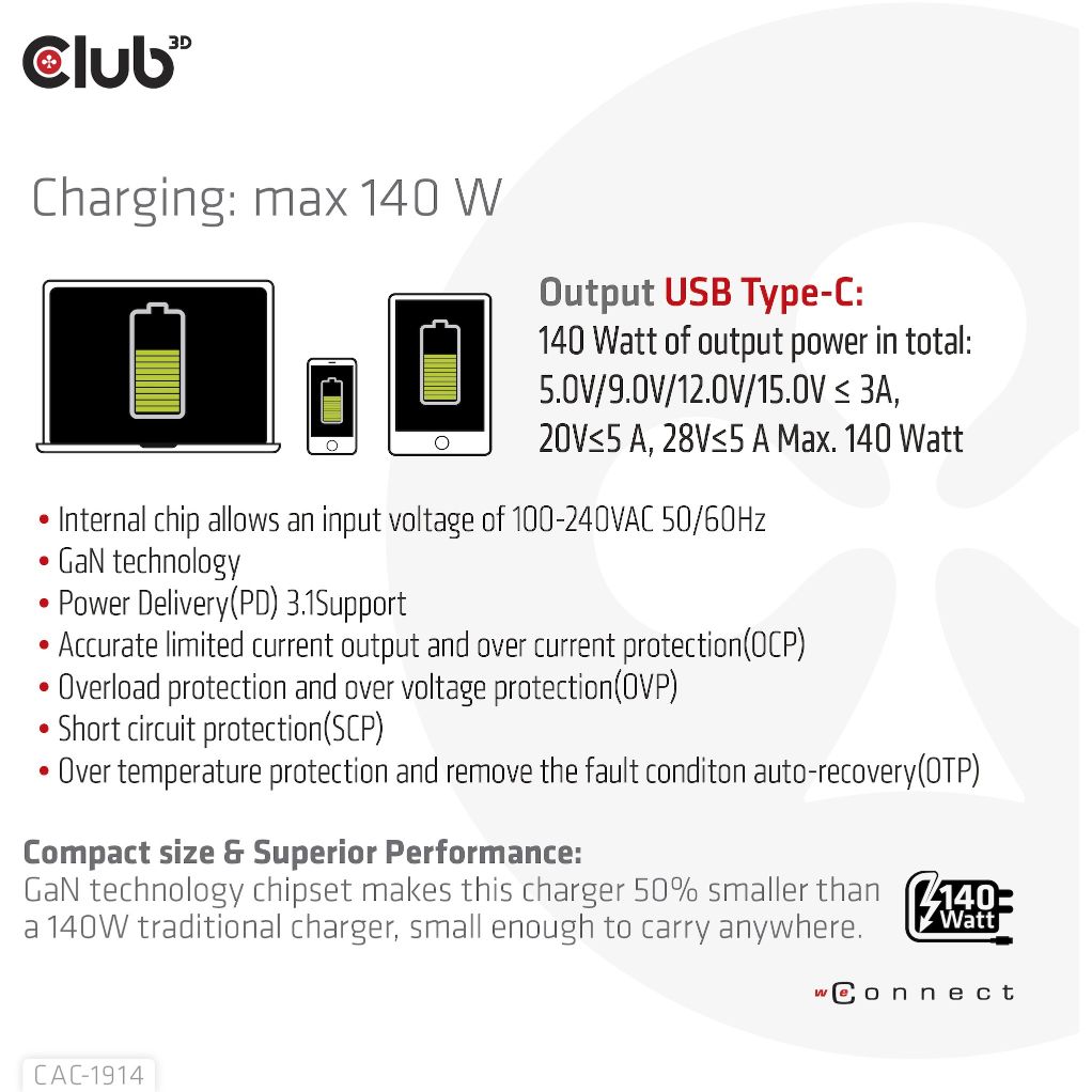 Club3D Ladegerät 1xUSB Typ C PD 140W. GaN retail