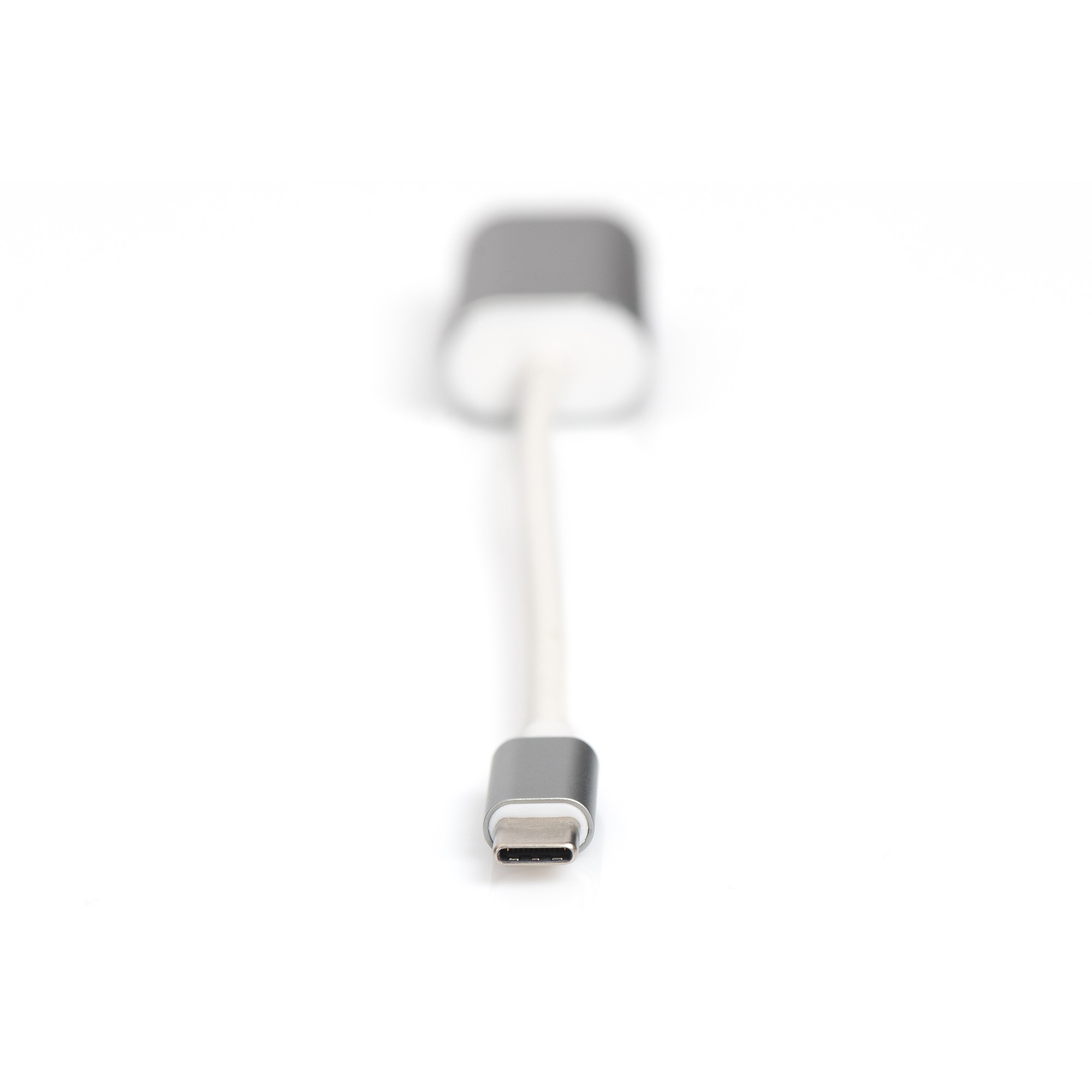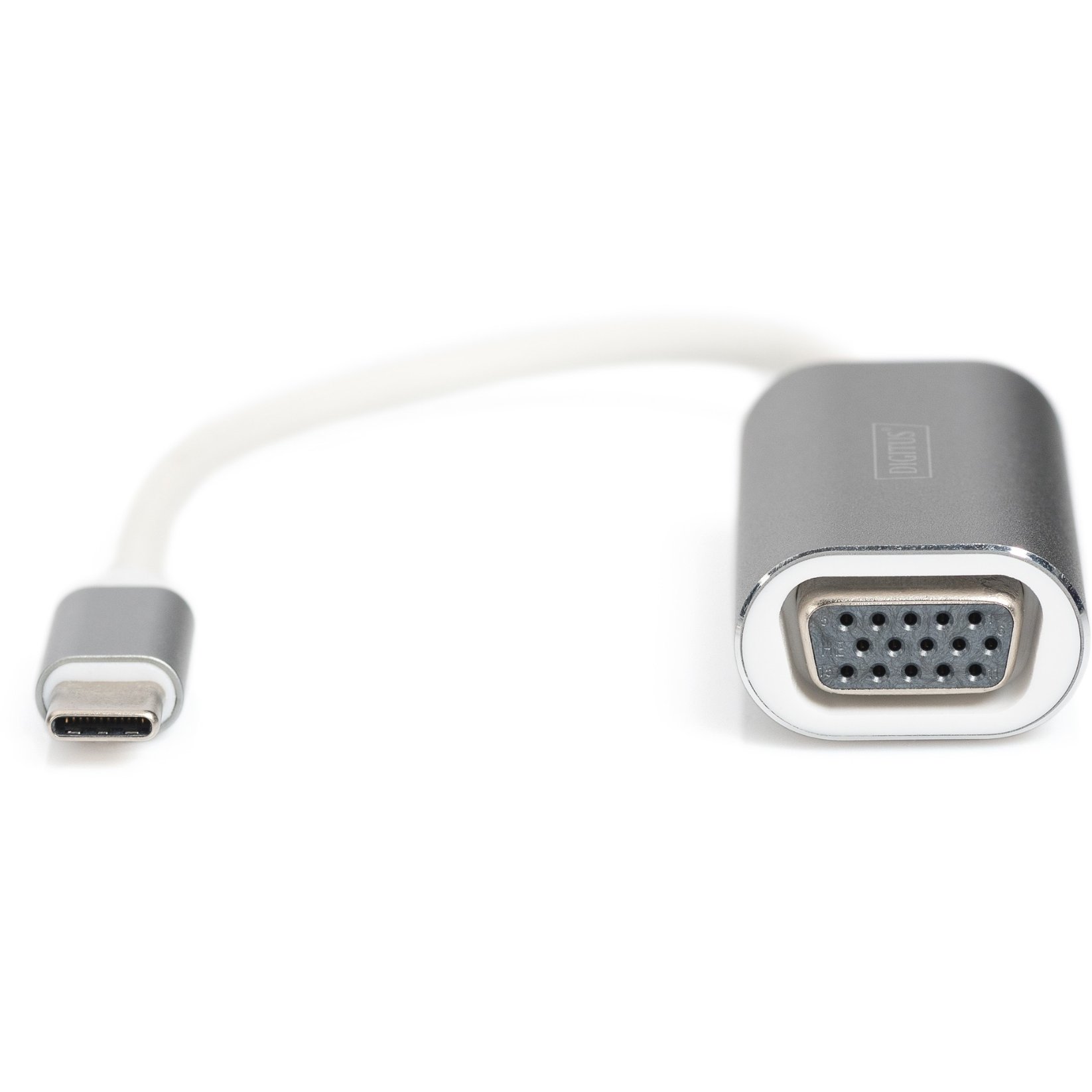 Digitus USB Type-C™ VGA Grafik-Adapter. Kabellänge: 0,2 m, Anschluss 1: USB Typ-C, Anschluss 2: VGA (D-Sub). Gewicht: 45 g, Breite: 37,6 mm, Tiefe: 46 mm. Verpackungsbreite: 115 mm, Verpackungstiefe: 140 mm, Verpackungshöhe: 40 mm. Kabelfarbe: Weiß