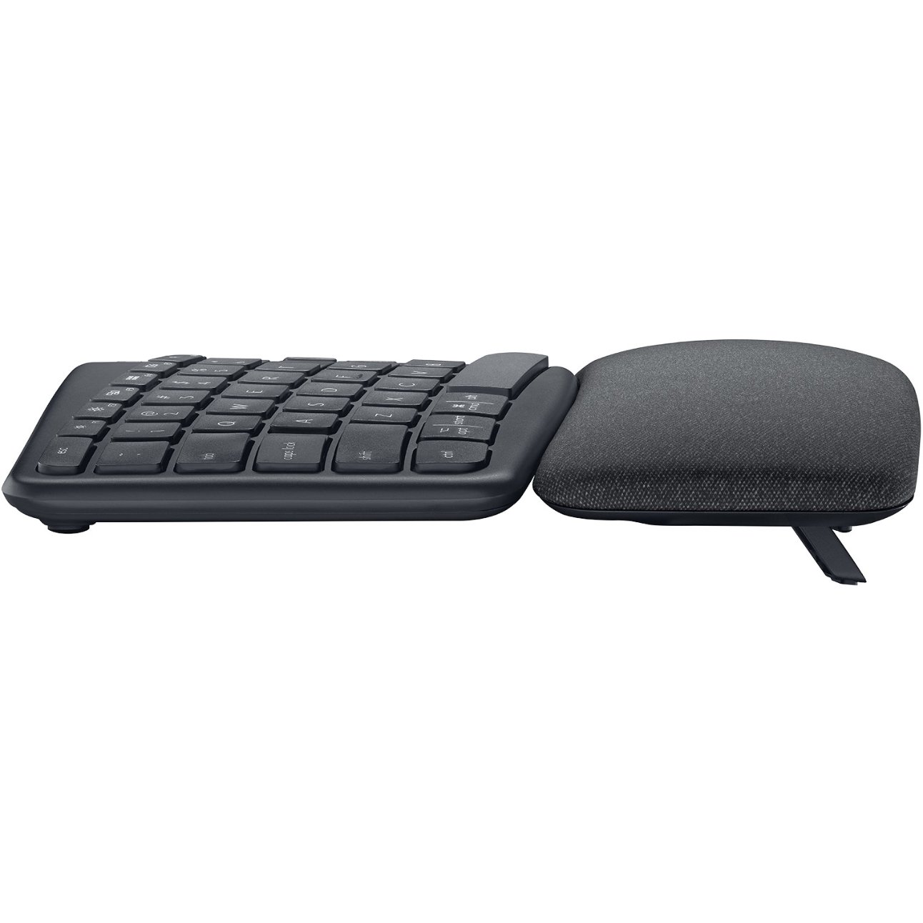 Logitech ERGO K860. Tastatur Formfaktor: Volle Größe (100%). Tastatur-Stil: Geschwungen. Übertragungstechnik: Kabellos, Geräteschnittstelle: RF Wireless + Bluetooth, Tastatur-Switch: Halbmechanischer Schlüsselschalter, Tastaturaufbau: QWERTY. Handgelenkauflage. Empfohlene Nutzung: Büro. Produktfarbe: Graphit