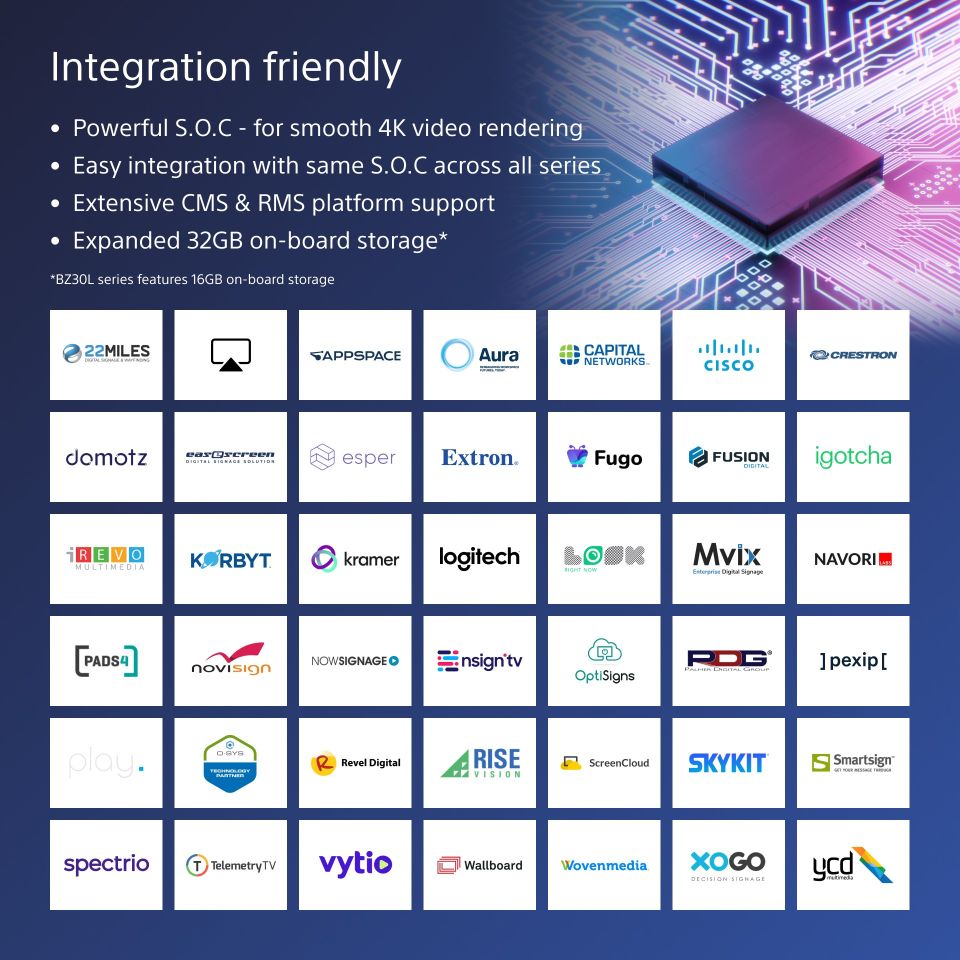 Sony FW-85BZ40L. Produktdesign: Digital Signage Flachbildschirm. Bildschirmdiagonale: 2,16 m (85″), Bildschirmtechnologie: LCD, Display-Auflösung: 3840 x 2160 Pixel, Helligkeit: 650 cd/m², HD-Typ: 4K Ultra HD. WLAN. Betriebszeiten (Stunden/Tage): 24/7. Installiertes Betriebssystem: Android. Produktfarbe: Schwarz