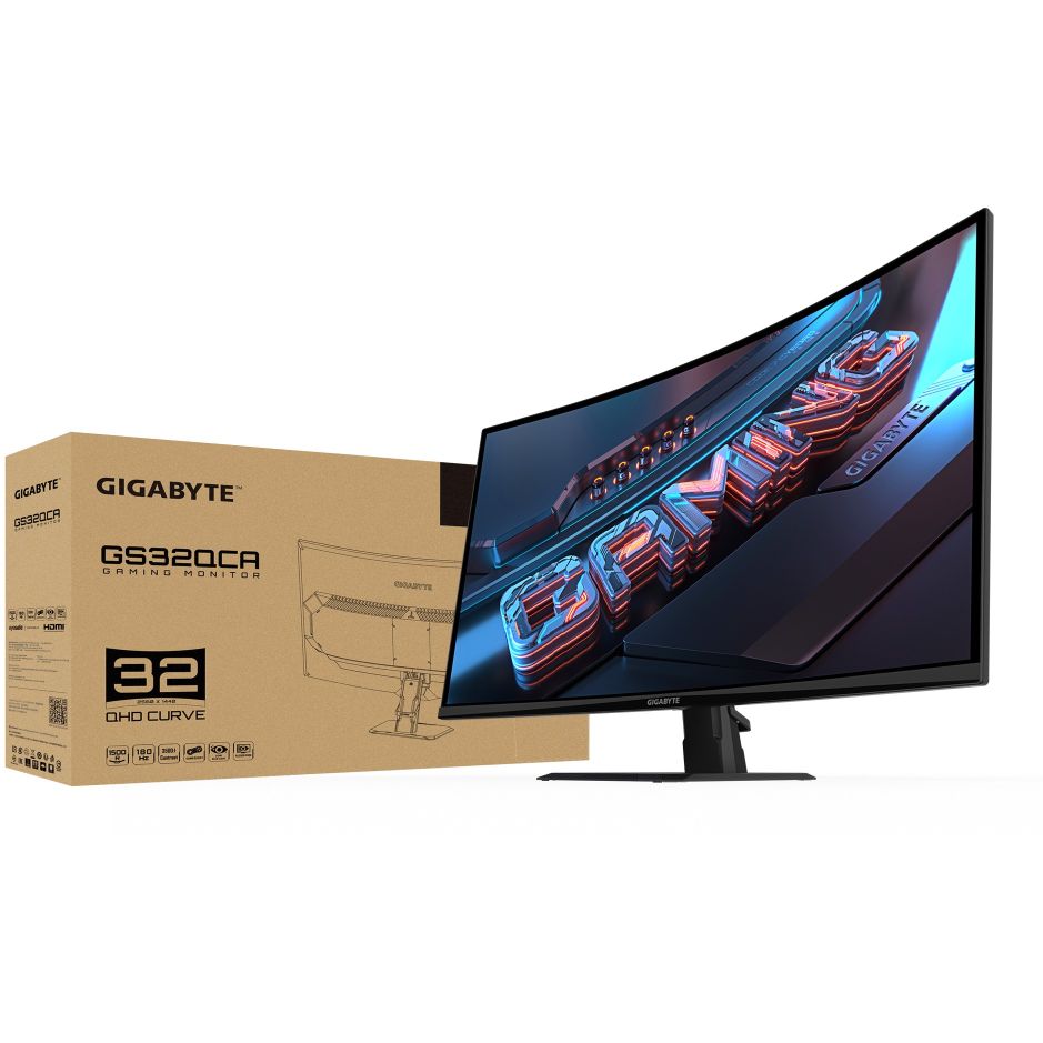GIGABYTE GS32QCA. Bildschirmdiagonale: 80 cm (31.5″), Display-Auflösung: 2560 x 1440 Pixel, HD-Typ: Quad HD, Bildschirmtechnologie: LED, Reaktionszeit: 1 ms, Natives Seitenverhältnis: 16:9, Bildwinkel, horizontal: 178°, Bildwinkel, vertikal: 178°. VESA-Halterung. Produktfarbe: Schwarz