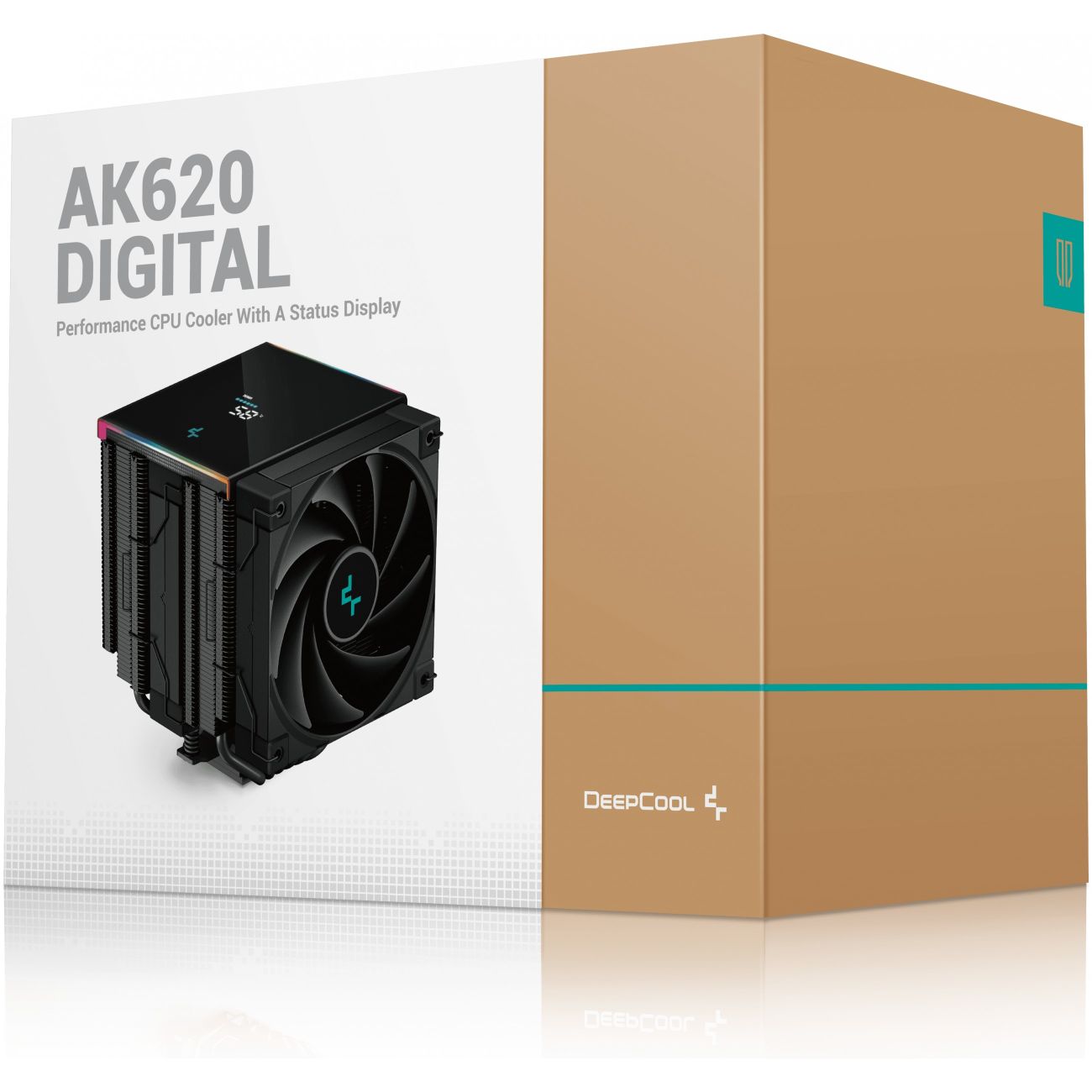 DeepCool AK620 DIGITAL. Typ: Luftkühlung, Lüfterdurchmesser: 12 cm, Maximum Luftdruck: 2,19 mmH2O. Breite: 129 mm, Tiefe: 138 mm, Höhe: 162 mm. Produktfarbe: Schwarz