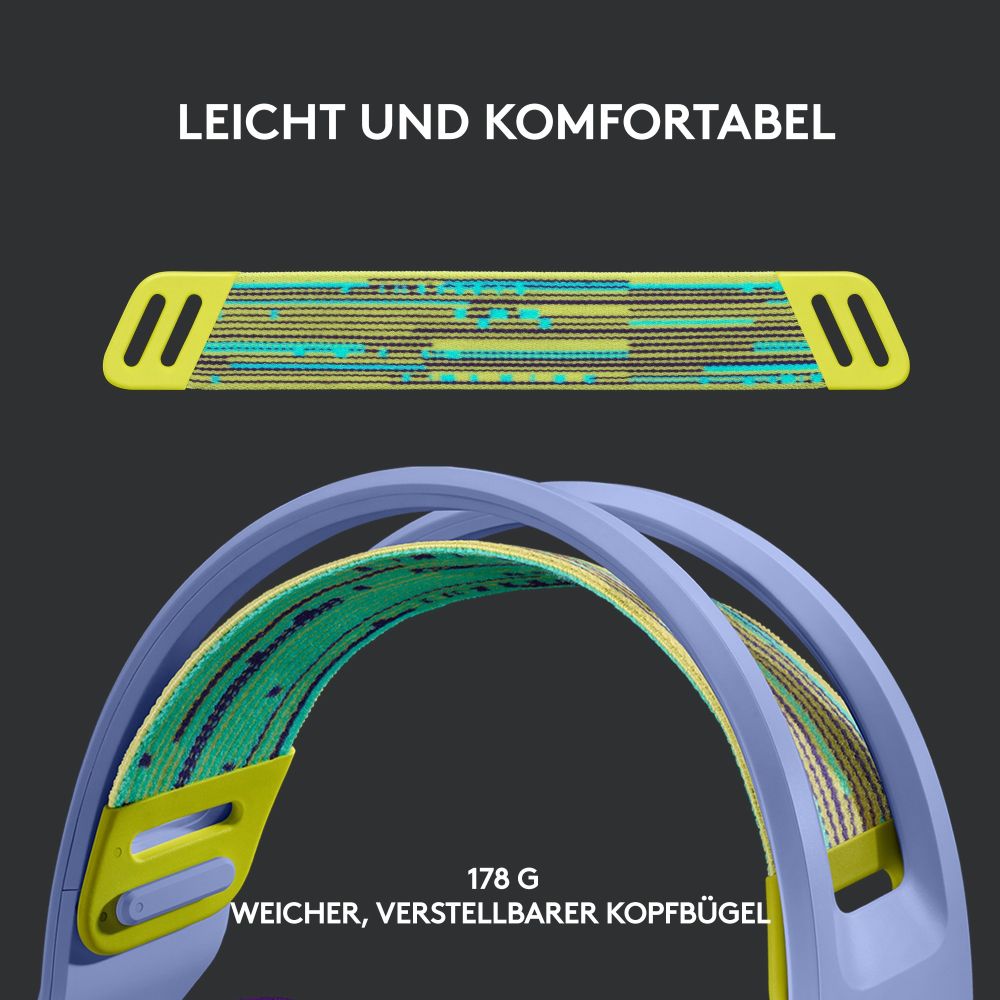 Logitech G 981-000890. Produkttyp: Kopfhörer. Übertragungstechnik: Kabellos. Empfohlene Nutzung: Gaming. Kopfhörerfrequenz: 20 – 20000 Hz. Kabellose Reichweite: 20 m. Gewicht: 278 g. Produktfarbe: Lila