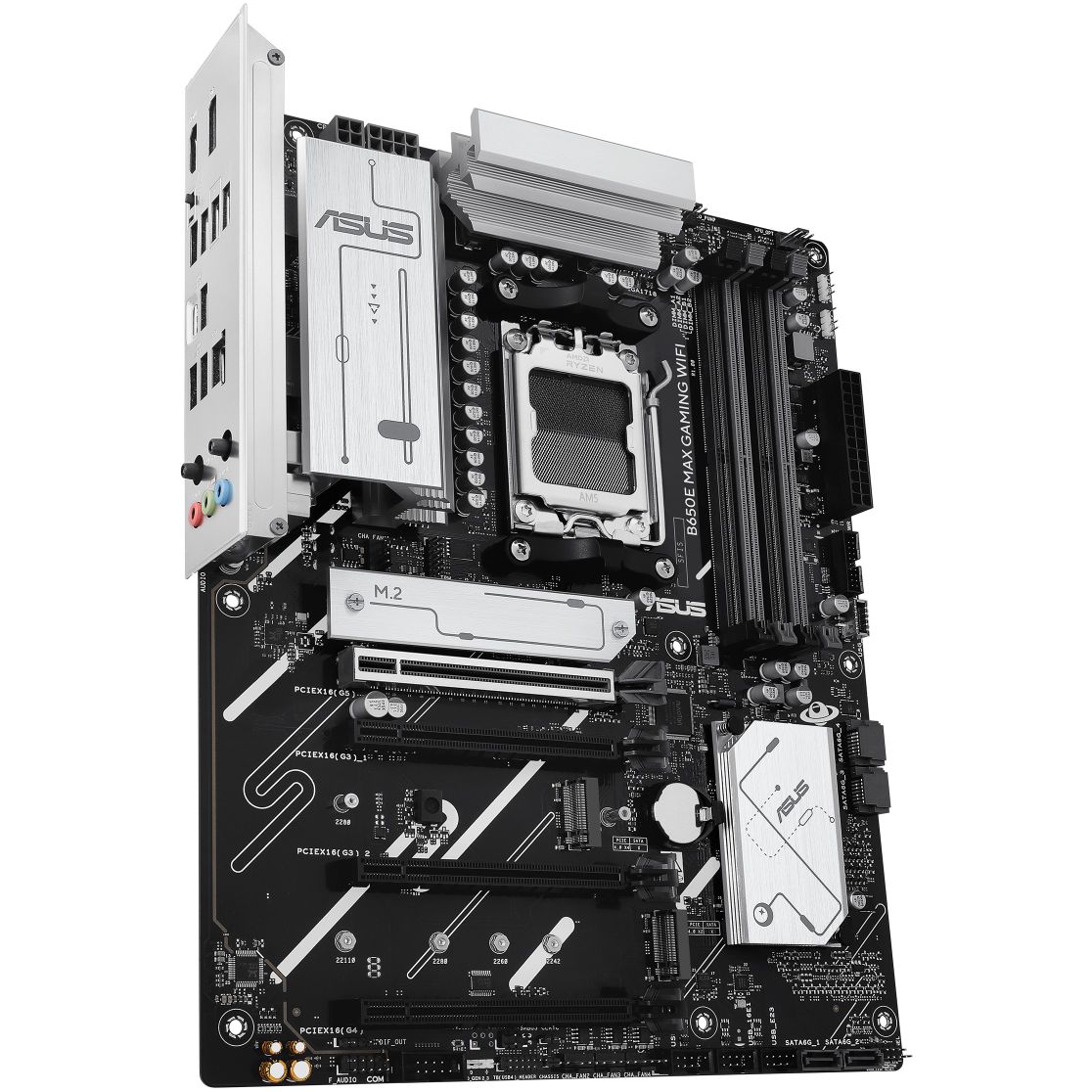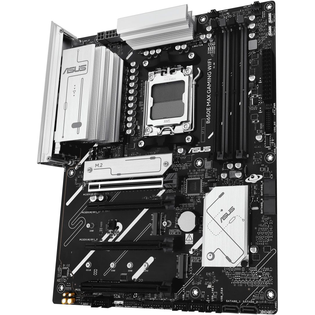 ASUS B650E MAX GAMING WIFI. Prozessorhersteller: AMD, Prozessorsockel: Sockel AM5, Kompatible Prozessoren: AMD Ryzen 7000 Series, AMD Ryzen 8000 Series, AMD Ryzen 9000 Series. Unterstützte Arbeitsspeicher: DDR5-SDRAM, RAM-Speicher maximal: 256 GB, Arbeitsspeicher Typ: DIMM. Unterstützte Speicherlaufwerk-Schnittstellen: M.2, PCI Express 5.0, SATA III, Unterstützte Speicherlaufwerke: HDD & SSD, RAID Level: 0, 1, 5, 10. Ethernet Schnittstellen Typ: 2.5 Gigabit Ethernet, Top WLAN-Standard: Wi-Fi 6E (802.11ax), WLAN-Standards: Wi-Fi 6E (802.11ax). Komponente für: PC, Motherboardformfaktor: ATX, Motherboard Chipsatz Familie: AMD