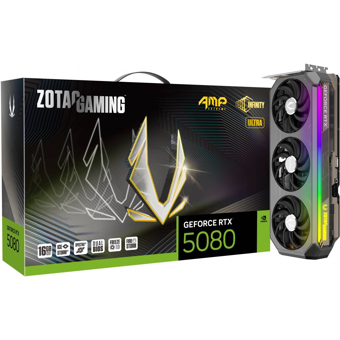 Zotac GAMING GeForce RTX 5080 AMP Extreme INFINITY ULTRA. Grafikprozessorenfamilie: NVIDIA, GPU: GeForce RTX 5080. Separater Grafik-Adapterspeicher: 16 GB, Grafikkartenspeichertyp: GDDR7, Breite der Speicherschnittstelle: 256 Bit. Maximale Auflösung: 7680 x 4320 Pixel. DirectX-Version: 12 Ultimate, OpenGL-Version: 4.6. Schnittstelle: PCI Express x16 5.0. Kühlung: Aktiv, Anzahl Lüfter: 3 Lüfter, Farben der Beleuchtung: Multi