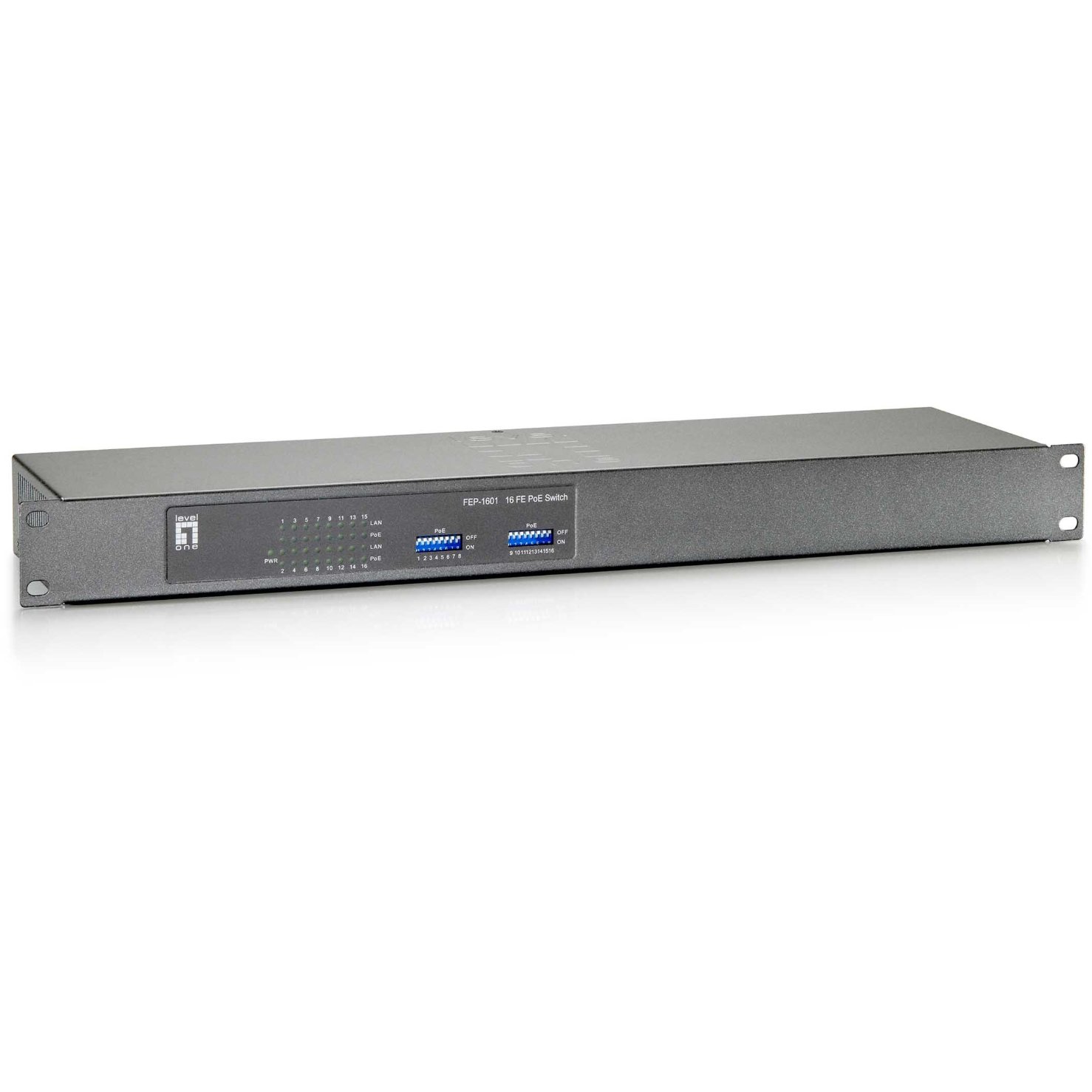 LevelOne FEP-1601W120. Basic Switching RJ-45 Ethernet Ports-Typ: Fast Ethernet (10/100), Anzahl der basisschaltenden RJ-45 Ethernet Ports: 16. Vollduplex. MAC-Adressentabelle: 4000 Eintragungen, Routing-/Switching-Kapazität: 3,2 Gbit/s. Netzstandard: IEEE 802.3, IEEE 802.3u, IEEE 802.3x. Power over Ethernet (PoE). Rack-Einbau