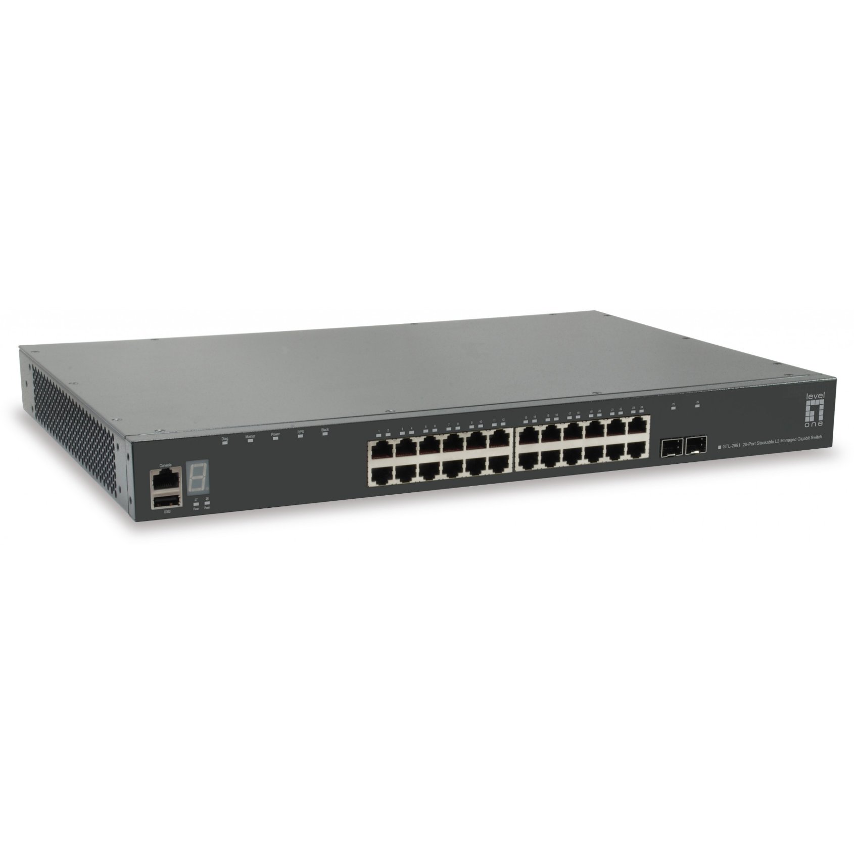 LevelOne GTL-2891. Switch-Typ: Managed, Switch-Ebene: L3. Basic Switching RJ-45 Ethernet Ports-Typ: Gigabit Ethernet (10/100/1000), Anzahl der basisschaltenden RJ-45 Ethernet Ports: 24, Konsolen-Port: RJ-45. Vollduplex. MAC-Adressentabelle: 16000 Eintragungen, Routing-/Switching-Kapazität: 128 Gbit/s. Netzstandard: IEEE 802.1D, IEEE 802.1Q, IEEE 802.1ag, IEEE 802.1p, IEEE 802.1s, IEEE 802.1w, IEEE 802.1x, IEEE…. Rack-Einbau