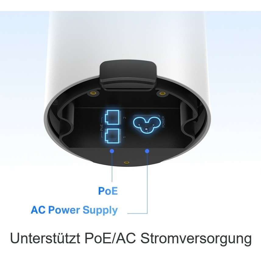 TP-Link Deco X50-Outdoor. Produktfarbe: Weiß, Antennentyp: Intern, Produkttyp: Mesh-System. WLAN-Band: Dual-Band (2,4 GHz/5 GHz), Top WLAN-Standard: Wi-Fi 6 (802.11ax), WLAN-Standards: Wi-Fi 6 (802.11ax). Virtueller Assistent: Amazon Alexa & Google Assistant, Cloud-Services unterstützt: TP-Link ID. AC Eingangsspannung: 100-240 V, AC-Adapter Eingangsstrom: 0,5 A, AC Eingangsfrequenz: 50/60 Hz. Zertifizierung: CE, FCC, RoHS