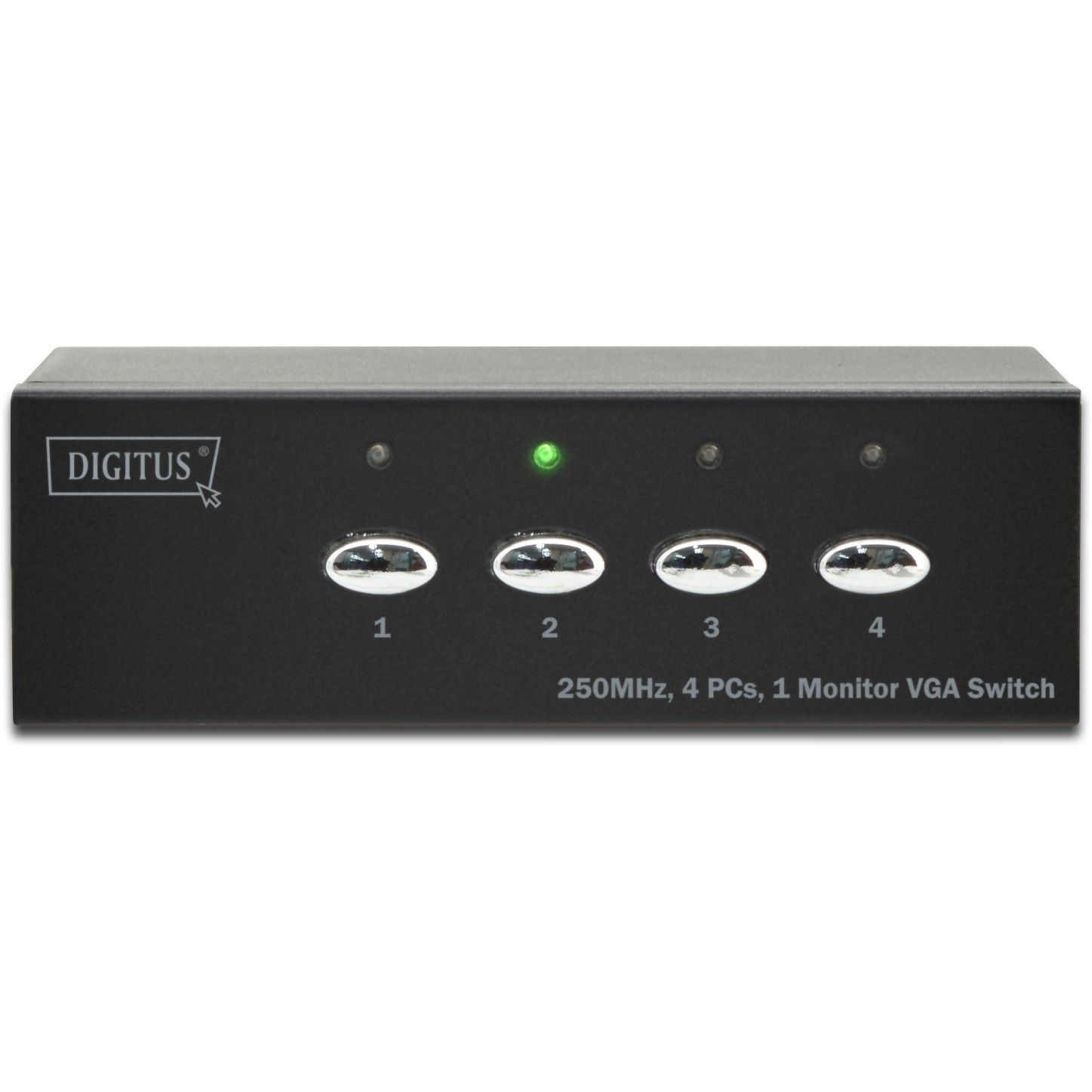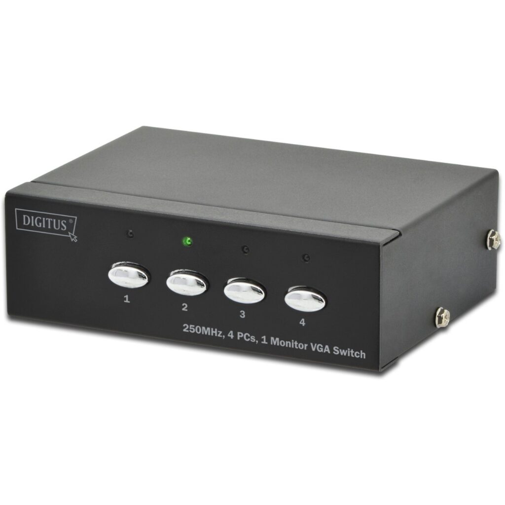 Digitus VGA Switch 4 PCs, 1 Monitor. Video Porttyp: VGA, Teilnehmerausgang: VGA. Produktfarbe: Schwarz, Bandbreite: 250 MHz, Maximale Auflösung: 1920 x 1080 Pixel. Verpackungsbreite: 255 mm, Verpackungstiefe: 60 mm, Paketgewicht: 830 g. Ursprungsland: China
